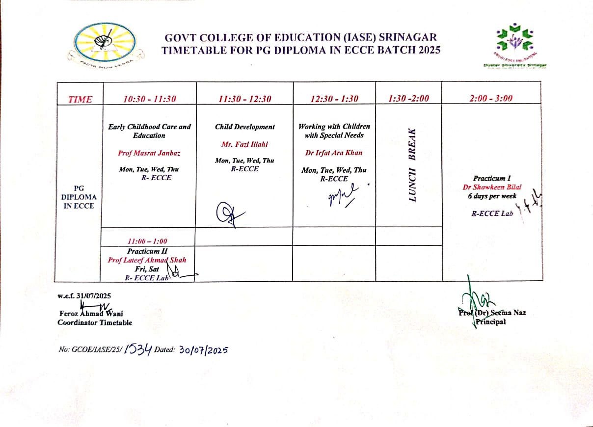 Click here to download Time Table for PG Diploma in ECCE 1st Semester Batch 2025. W.E.F.-16/09/2025.