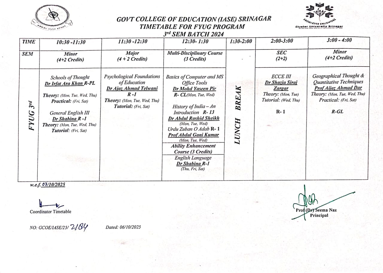 Click here to download Timetable for FYUG Program 3rd Semester Batch 2024. W.E.F:-02/10/2025.