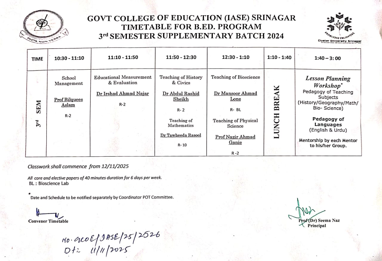 Click here to download time Table for B.Ed. Program 1st Sem (Supplementary) Preservice Batch 2025. W.E.F.-24/09/2025.